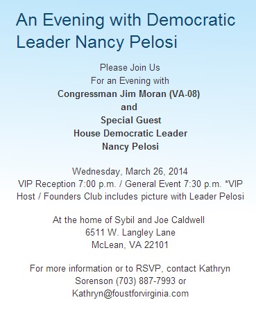 On Wednesday, Foust will have the Minority Leader in McLean to raise money for his campaign. Mr. Foust lives close enough to the Beltway to know that Nancy Pelosi is toxic to Democrat candidates across the country.