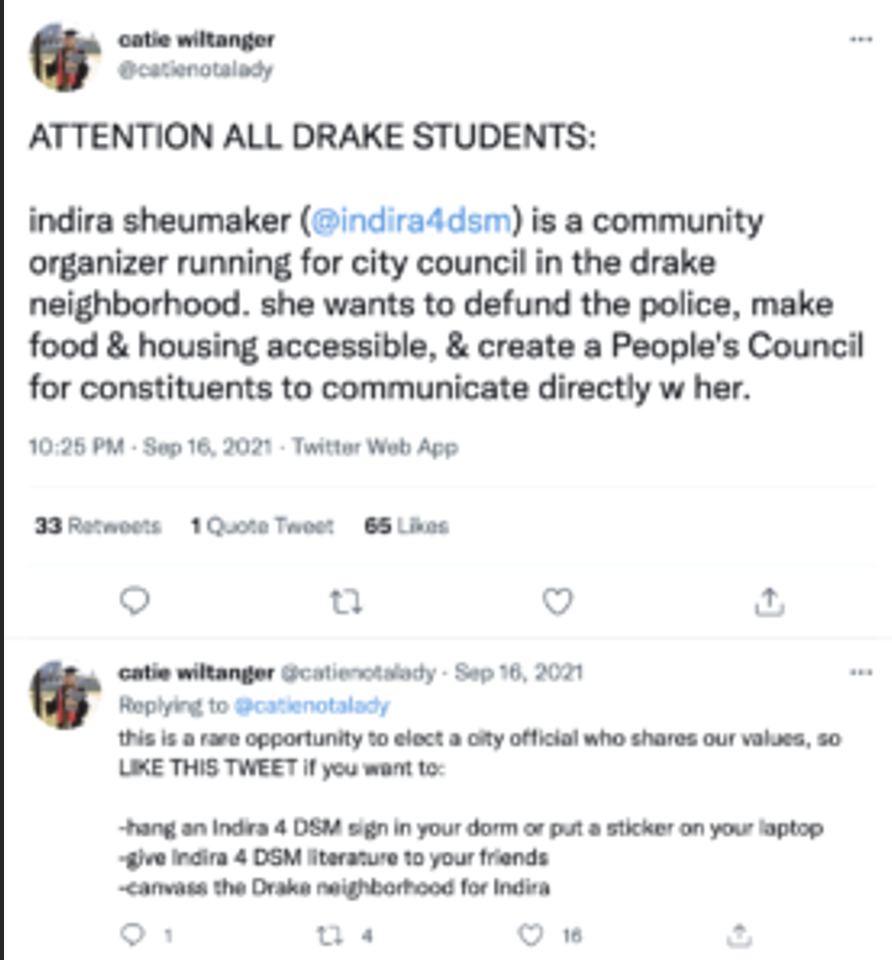 In September 2021 Wiltanger tweeted, “ATTENTION ALL DRAKE STUDENTS: indira sheumaker (@indira4dsm) is a community organizer running for city council in the drake neighborhood. she wants to defund the police, make food & housing accessible, & create a People’s Council for constituents to communicate directly w her. this is a rare opportunity to elect a city official who shares our values, so LIKE THIS TWEET if you want to: -hang an Indira 4 DSM sign in your dorm or put a sticker on your laptop -give Indira 4 DSM literature to your friends -canvass the Drake neighborhood for Indira.”