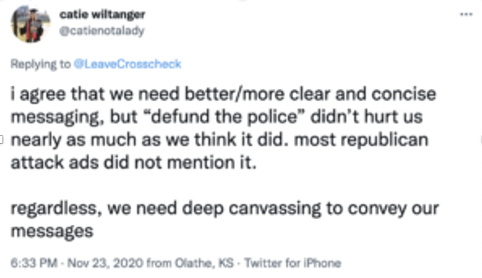 In November 2020, Wiltanger downplayed the impact of “defund the police” on Democrat losses in competitive races around the country, tweeting “i agree that we need better/more clear and concise messaging, but ‘defund the police’ didn’t hurt us nearly as much as we think it did. most republican attack ads did not mention it.”