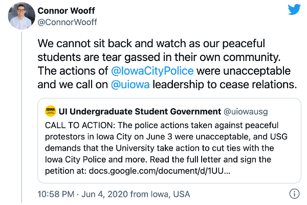 Wooff tweeted “We cannot sit back and watch as our peaceful students are tear gassed in their own community. The actions of @IowaCityPolice were unacceptable and we call on @uiowa leadership to cease relations.”