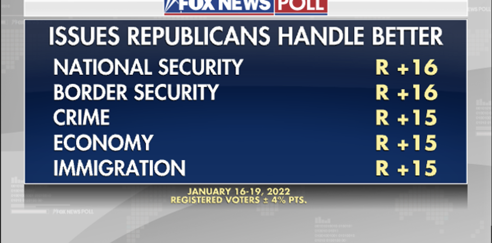 When it comes to the issues, Fox found Republicans hold a double-digit lead on national security, border security, crime, the economy, and immigration.