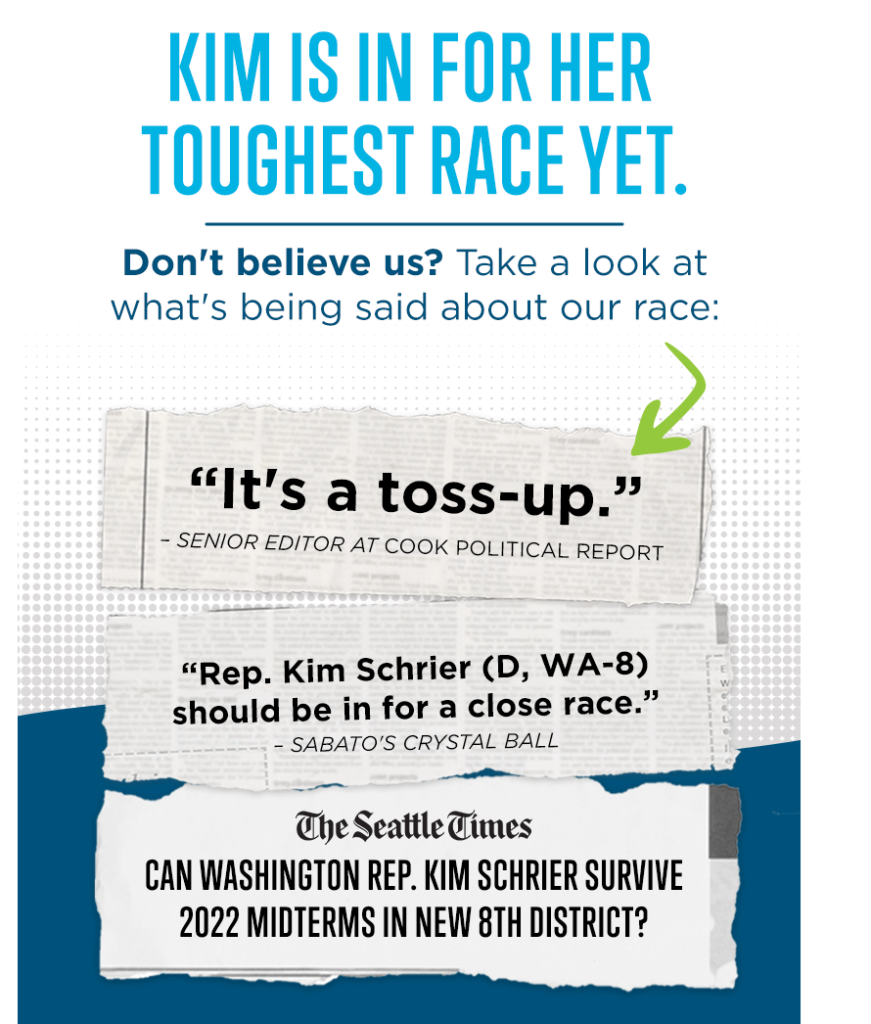 NRCC Comment: “Kim Schrier is facing her ‘toughest race yet’ thanks to her lockstep support of Nancy Pelosi’s toxic socialist agenda. Schrier has a choice: retire or lose.” – NRCC Spokeswoman Courtney Parella