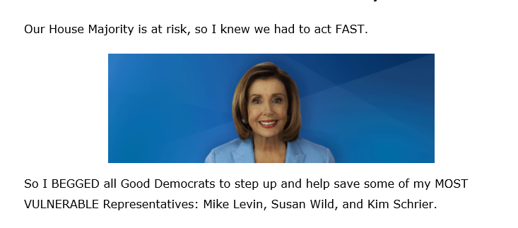 End Citizens United sent an email from Pelosi begging supporters to “step up and help save some of my MOST VULNERABLE Representatives.”