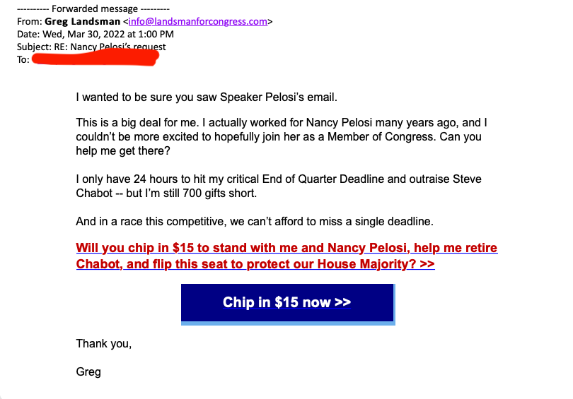 In a fundraising email, crooked Greg Landsman bragged about working with Nancy Pelosi.