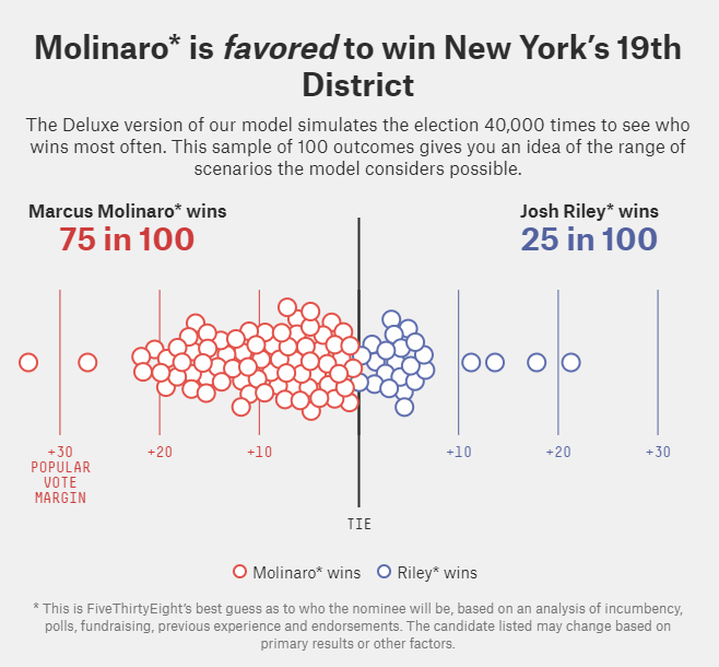FiveThirtyEight released their 2022 House forecast and they say Marc Molinaro is favored to beat Josh Riley in NY-19 in November: