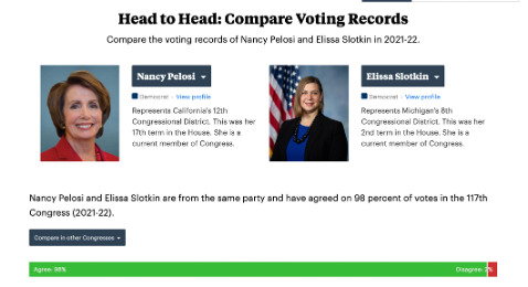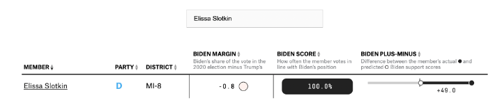 Slotkin votes with Joe Biden 100% of the time and votes with Nancy Pelosi 98% of the time:
