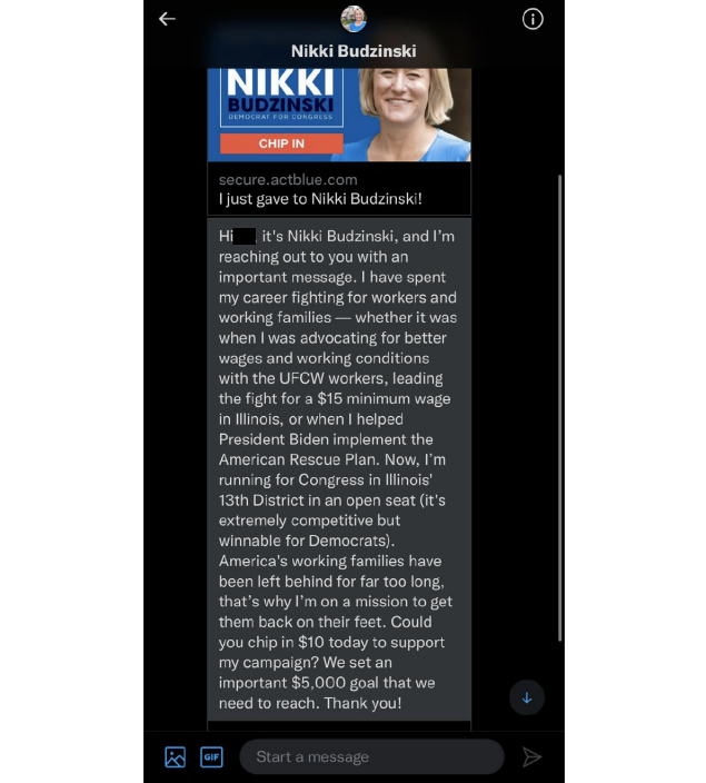 In her latest fundraising message, Nikki Budzinski brags about helping President Biden “implement the American Rescue Plan.”
