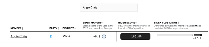 According to FiveThirtyEight Craig votes with Biden 100% of the time: