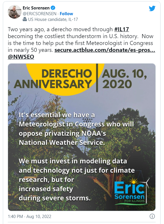 “It doesn’t get more desperate than Eric Sorensen shamelessly fundraising off a deadly derecho that killed four people,” said NRCC Spokeswoman Courtney Parella