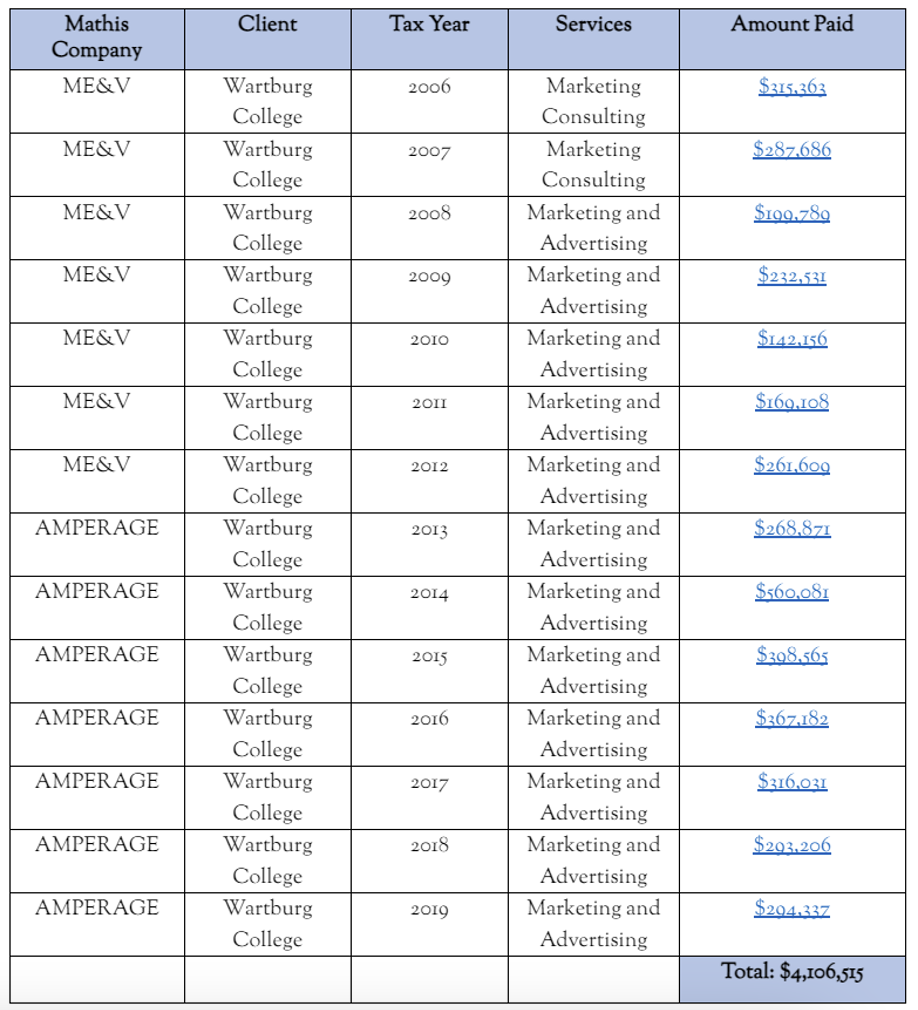 Every year since Mathis joined the board, the college has paid her business hundreds of thousands of dollars for “Marketing Consulting” AND “Marketing and Advertising.” As of 2019, the most recent filing available, Wartburg paid AMPERAGE/ME&V over $4 million.
