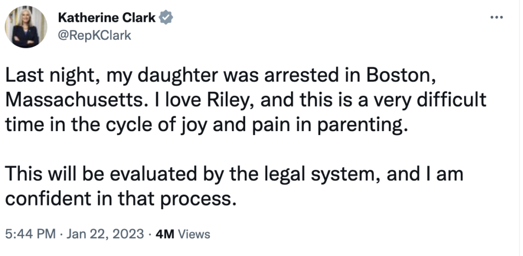 Last night Democratic Whip Katherine Clark acknowledged her child was arrested for assaulting an officer in an incident where the policeman was “hit in the face and could be seen bleeding from the nose and mouth.”