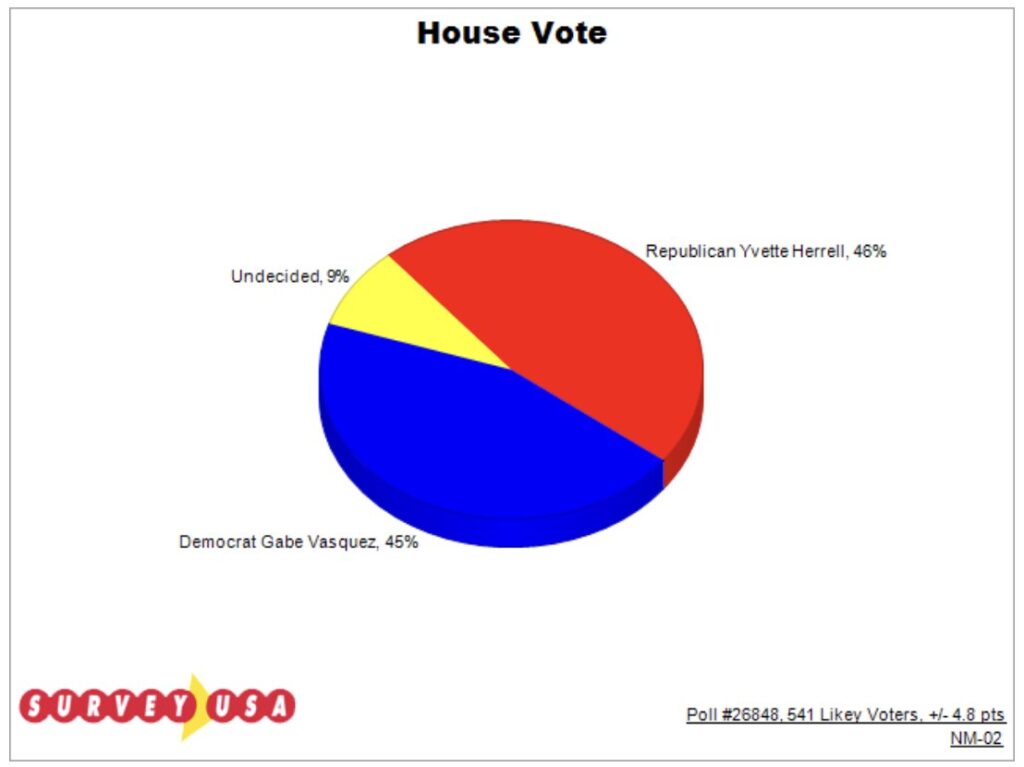 The poll shows Vasquez is trailing on the ballot to Yvette Herrell, noting that “Vasquez has a challenge” in NM-02.