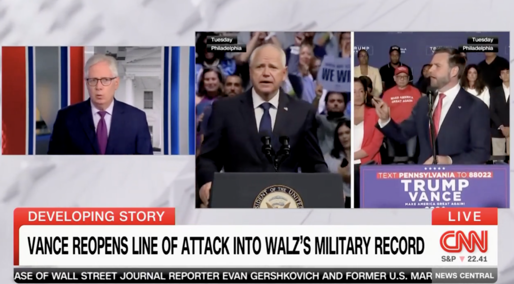 CNN: “Walz did make a comment, he’s done it a couple times, where he has used language that suggested that he carried weapons in a fighting situation. There is no evidence that any time that he was in the position of being shot at and some of his language could easily be seen to suggest that he was.”