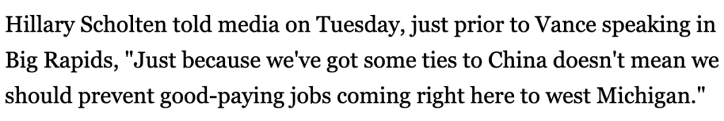 “Comrade Hillary Scholten is either completely clueless or cozying up to the commies. Scholten is publicly defending a CCP-tied project that’s sending hundreds of millions of taxpayer funds to the project. Her policies are a threat to Western Michigan.” – NRCC Spokesman Mike Marinella