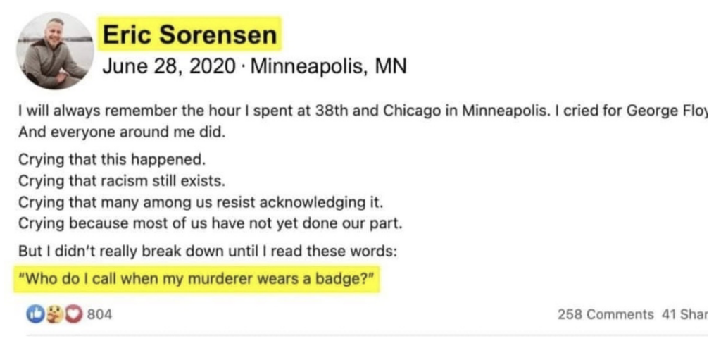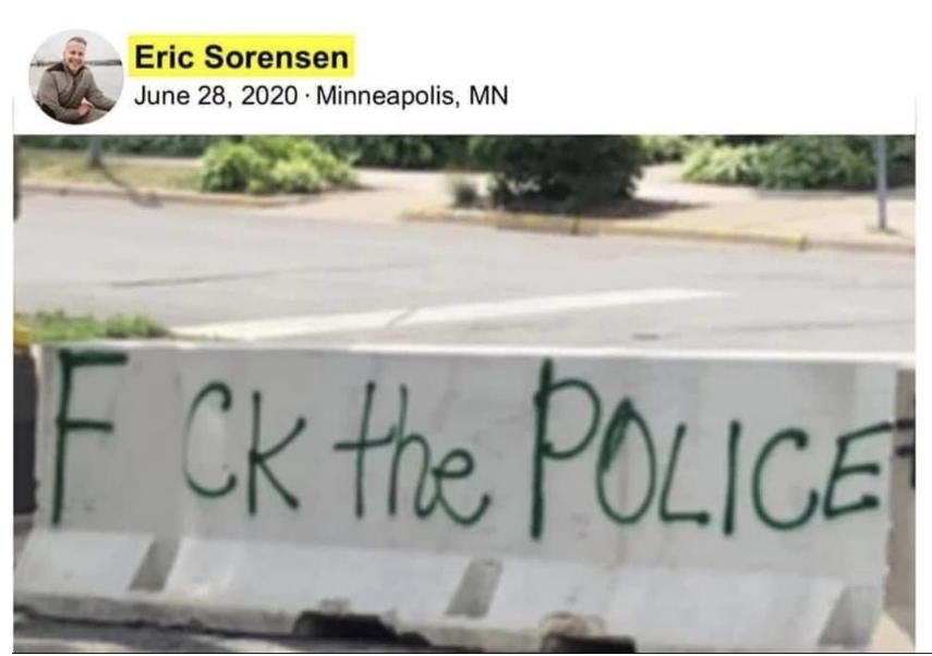 Let’s not forget that Eric Sorensen had a secret Facebook account that he used to post anti-police content, including a meme about defunding the police and images of graffiti that reads “All Cops Are B*******.” Sorensen is also backed by groups who support cashless bail and campaign with those who share the same values.