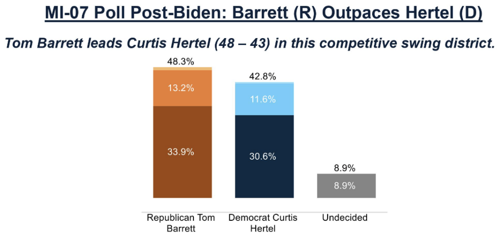 A new poll of Michigan’s 7th Congressional District from the National Republican Congressional Committee shared exclusively with National Journal showed Barrett leading Democratic former state Sen. Curtis Hertel, 48 percent to 43 percent. Roughly 9 percent of respondents were undecided. The poll was in the field from Aug. 27 to Aug. 29 and was conducted by GOP firm Cygnal. The margin of error was 4.76 percent, and the poll had a sample size of 420 likely voters.