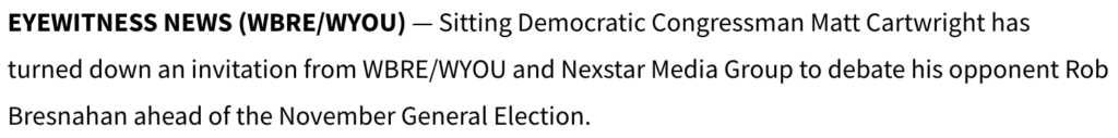 It’s official: Congressman Cartwright is a coward. Cartwright declined to debate Republican Rob Bresnahan because he’s too afraid to address how partisan he truly is and that he’s not actually “working for you.”