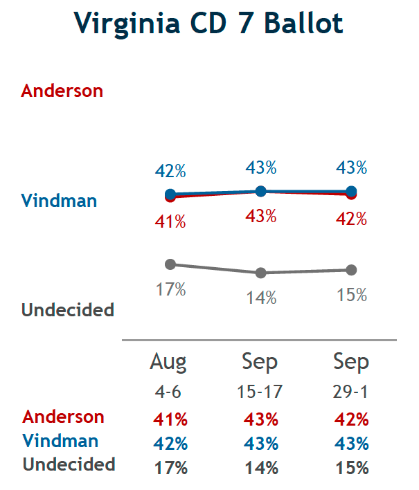 Once a safe Democrat district, VA-07 is now a “toss up” seat, as shown in today’s poll and polling in August and September.