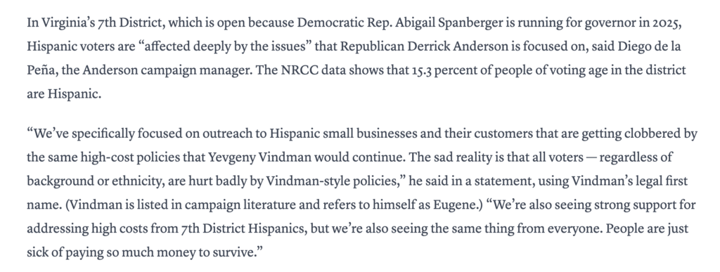 “Yevgeny Vindman is wildly unpopular and his inflationary and open-border policies are increasingly unpopular with Hispanic voters. It’s no wonder Virginia’s 7th is now a toss-up district.” — NRCC Spokeswoman Delanie Bomar