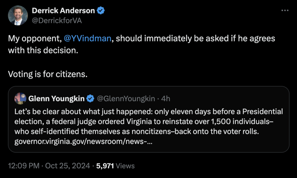 “Unless he clarifies otherwise, Vindman is on the side of his Democrat party leaders and supports keeping illegal immigrants on voter rolls. Virginians deserve to know: why does Vindman support opening our elections to noncitizens?” — NRCC Spokeswoman Delanie Bomar