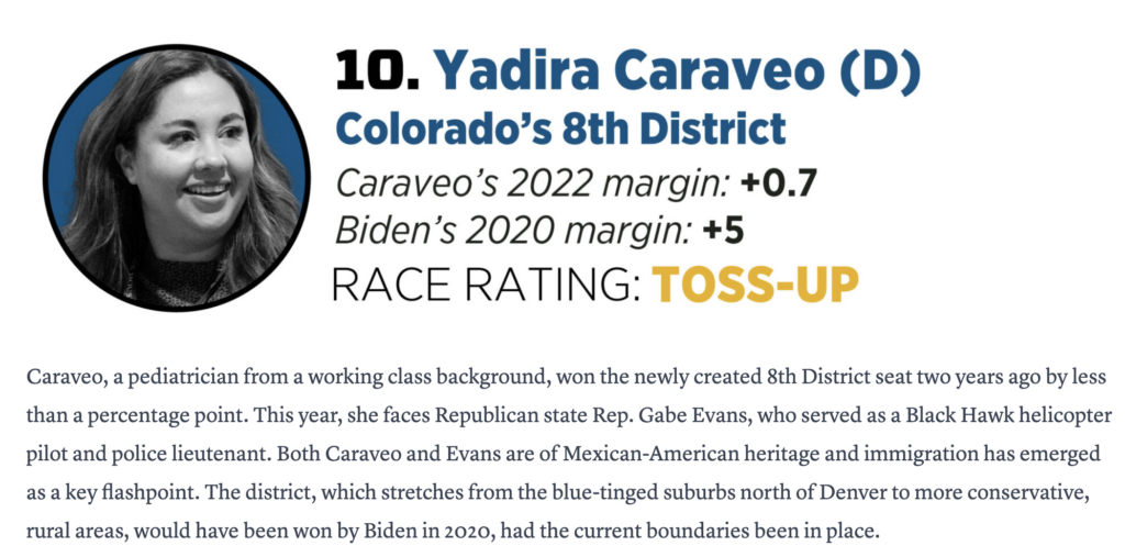 Yadira Caraveo clocks in at the 10th most vulnerable nationwide and the 3rd most vulnerable Democrat incumbent.