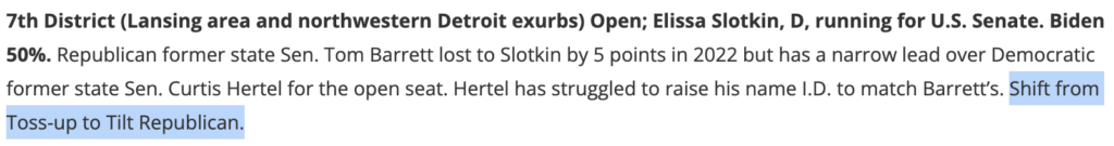In the past 24 hours, the nonpartisan Cook Political Report and Inside Elections both moved MI-07 toward Republican Tom Barrett.