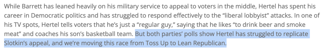 “This race has shaped up to be what we’ve been saying all along: Curtis Hertel is a sleazy lobbyist who is too liberal for Michigan and Tom Barrett is a badass military helicopter pilot who will deliver results for Michigan. This seat is in a prime position to flip red in just under a week.” — NRCC Spokesman Mike Marinella