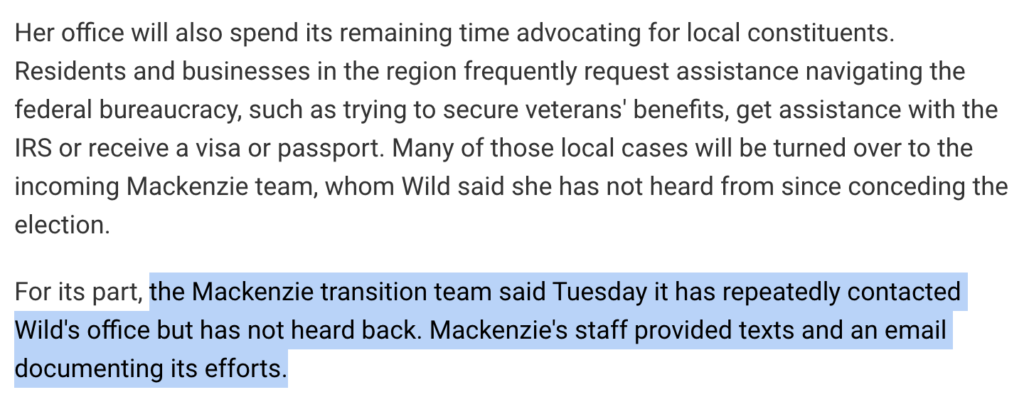 Susan Wild claimed Rep.-elect Mackenzie’s team hasn’t reached out, but she was caught in a desperate lie.
