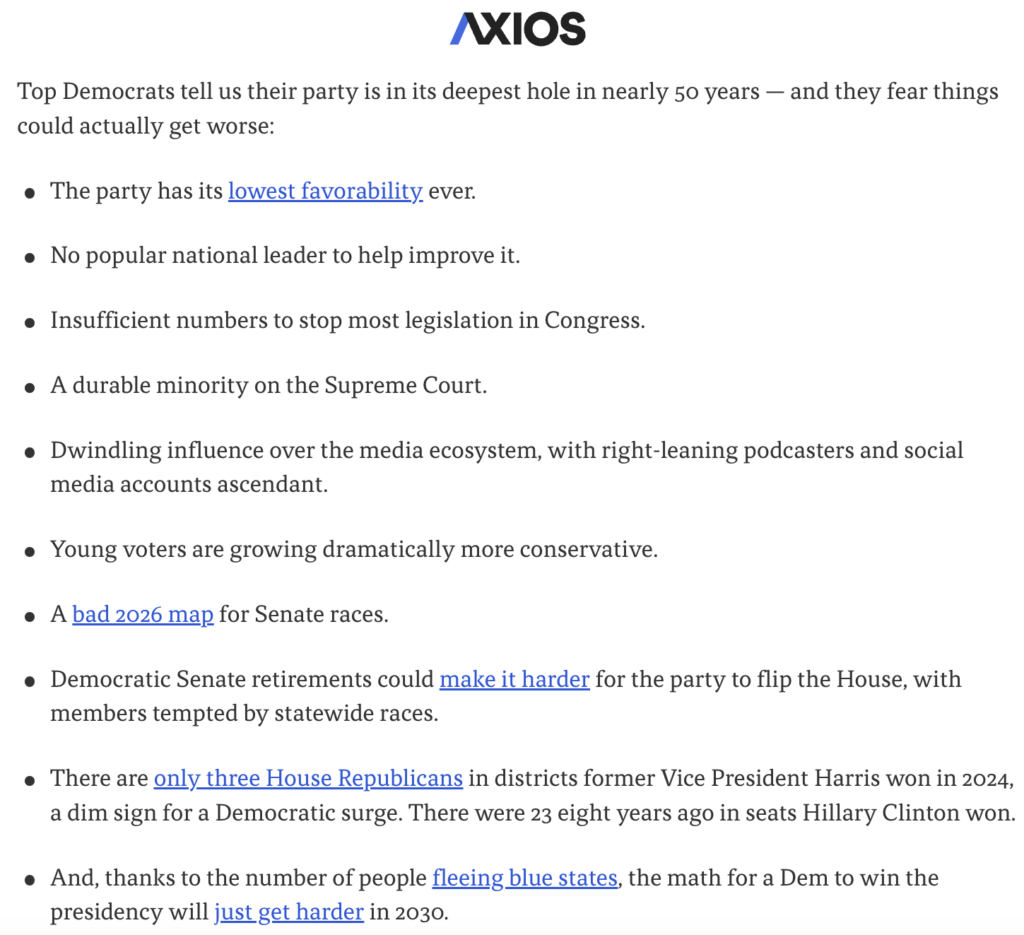 There’s no question the Democrat Party is in shambles, and Axios laid out exactly why top Democrats claim their party is in its “deepest hole in at least the 45 years since Ronald Reagan’s victory in 1980.”