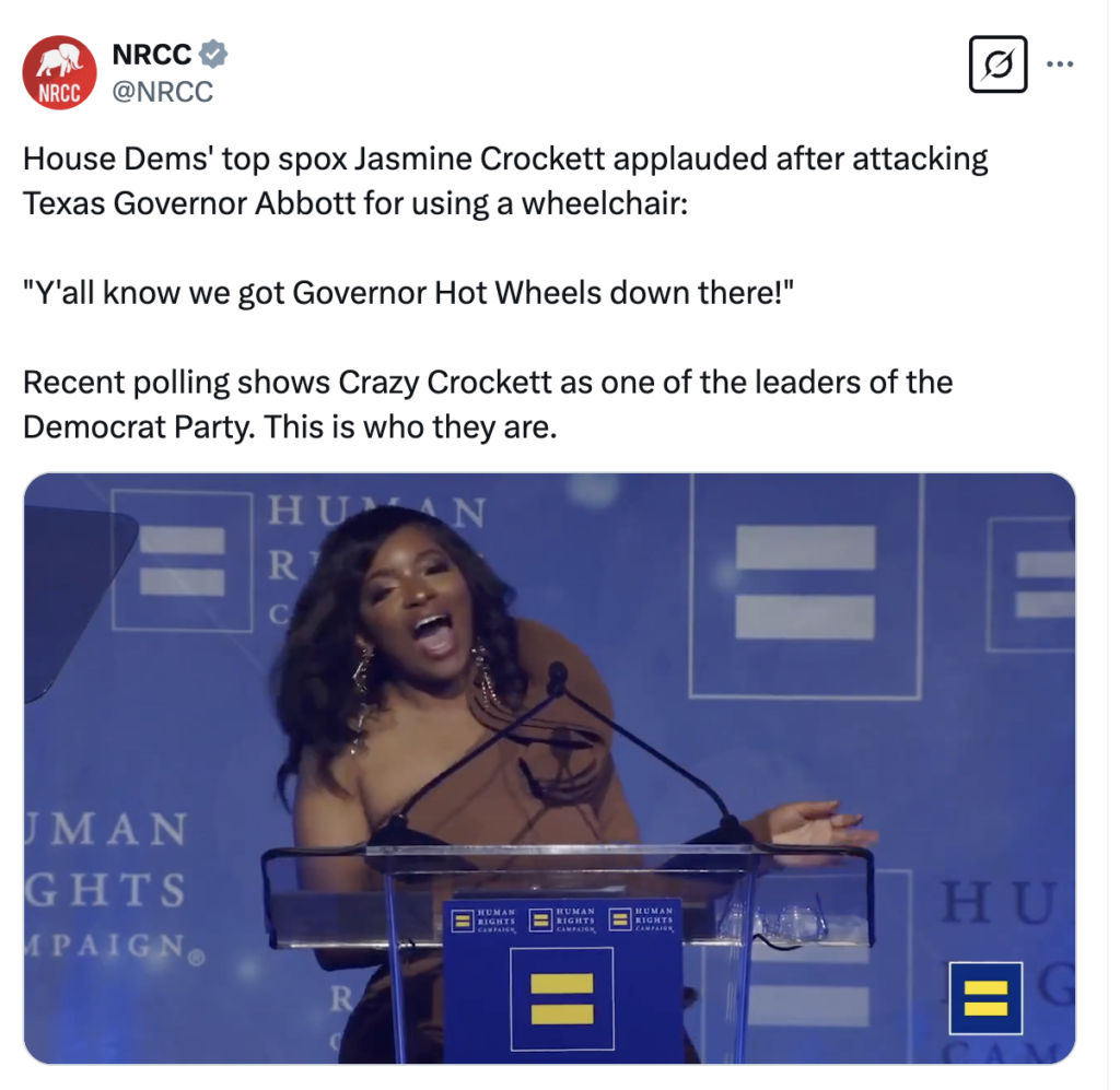 La nueva líder Demócrata Jasmine Crockett fue ovacionada por burlarse de la discapacidad del gobernador de Texas, Greg Abbott, llamándolo “Gobernador Hot Wheels.”