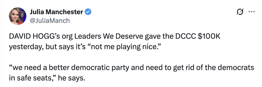 Yesterday, DNC Vice Chair David Hogg’s group, Leaders We Deserve, the same group leading a $20 million crusade to primary sitting House Democrats, cut a $100,000 check to the DCCC. To add to the chaos, Hogg said the donation is “not me playing nice…we need a better democratic party and need to get rid of the democrats in safe seats.”