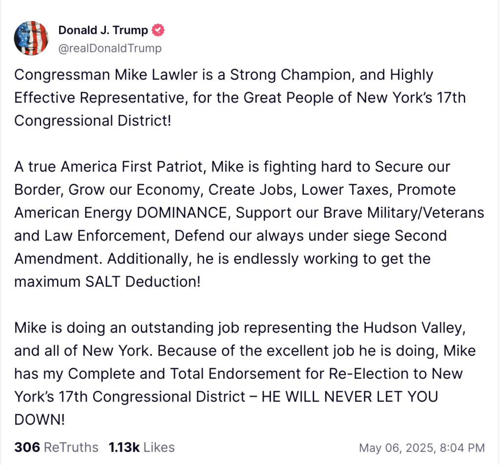 “President Trump’s powerful endorsement adds to Representative Mike Lawler’s growing momentum for 2026. Lawler has been hard at work delivering lower costs, safer streets, and a secure border for New York families – and he’s not letting up. ” – NRCC Spokeswoman Maureen O’Toole