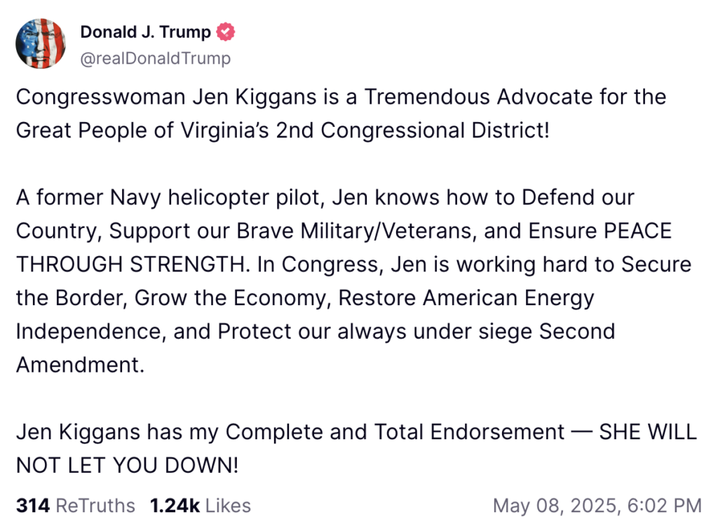 “President Trump’s powerful endorsement adds to Representative Jen Kiggans’ growing momentum for 2026. Kiggans has been hard at work delivering lower costs, safer streets, and a secure border for Virginia families – and she’s not letting up. ” – NRCC Spokeswoman Maureen O’Toole