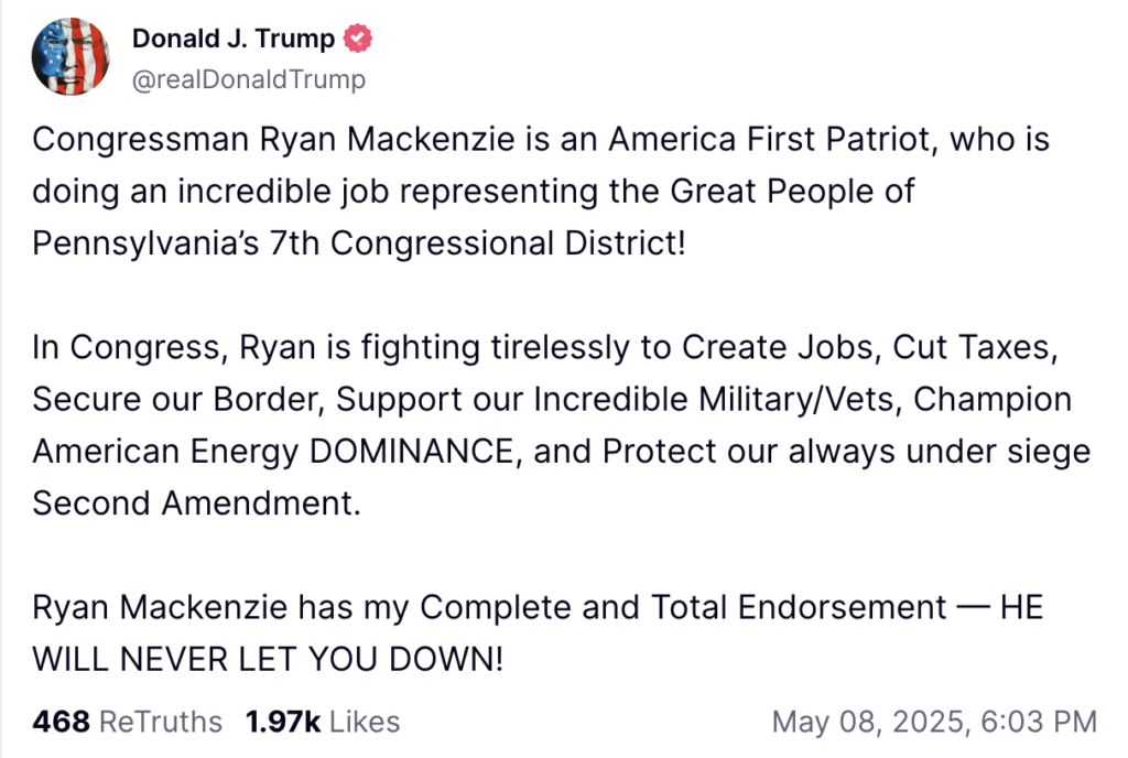 “President Trump’s powerful endorsement adds to Representative Ryan Mackenzie’s growing momentum for 2026. Mackenzie has been hard at work delivering lower costs, safer streets, and a secure border for Pennsylvania families – and he’s not letting up. ” – NRCC Spokeswoman Maureen O’Toole