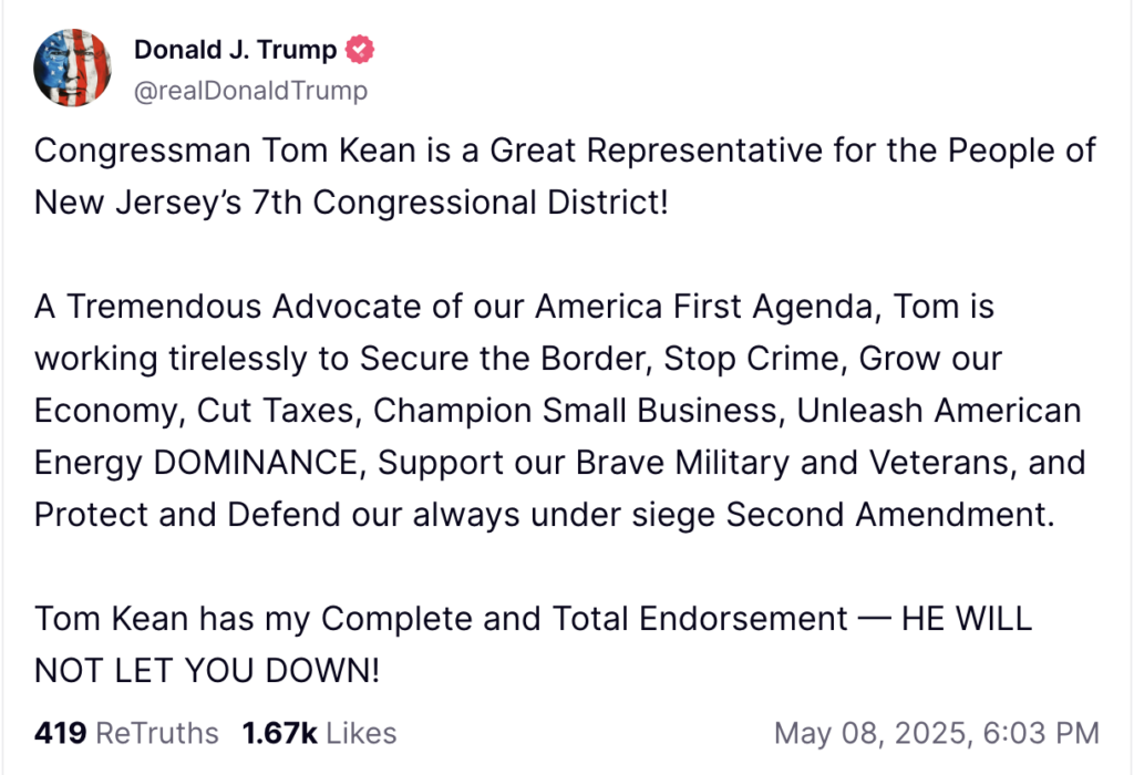 “President Trump’s powerful endorsement adds to Representative Tom Kean, Jr.’s growing momentum for 2026. Kean has been hard at work delivering lower costs, safer streets, and a secure border for New Jersey families – and he’s not letting up. ” – NRCC Spokeswoman Maureen O’Toole