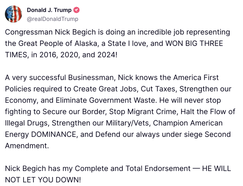 “President Trump’s powerful endorsement adds to Representative Nick Begich’s growing momentum for 2026. Representative Begich has been hard at work, unleashing American energy, empowering local governance, and lowering costs for Alaskans – and he’s not letting up.” – NRCC Spokesman Zach Bannon