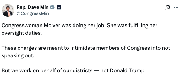 Last night, Democrat LaMonica McIver was charged for assaulting, impeding, and interfering with law enforcement when she stormed an ICE facility and out of touch Dave Min stands by her, claiming she was just “doing her job.”