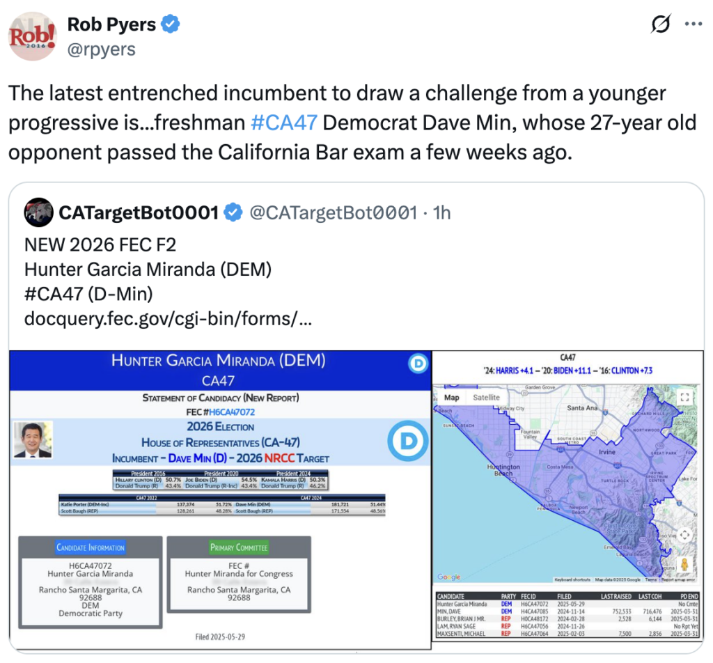 “Democrat Dave Min is taking fire from his own party as a progressive challenger circles like a vulture. Even radical Democrat voters know that Min is a do-nothing placeholder whose only real talent is disappointing Californians, including his own base. While California Democrats tear each other apart, out of touch Min will be too busy trying to save his own skin to fight for anyone else – least of all Californians.” – NRCC Spokesman Christian Martinez