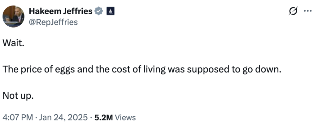 “Happy National Egg Day to Hakeem Jeffries and House Democrats, who miraculously stopped talking about egg prices as soon as President Trump and Republicans took control of the wheel. It’s quite the egg on the face moment for them.” — NRCC Spokesman Mike Marinella