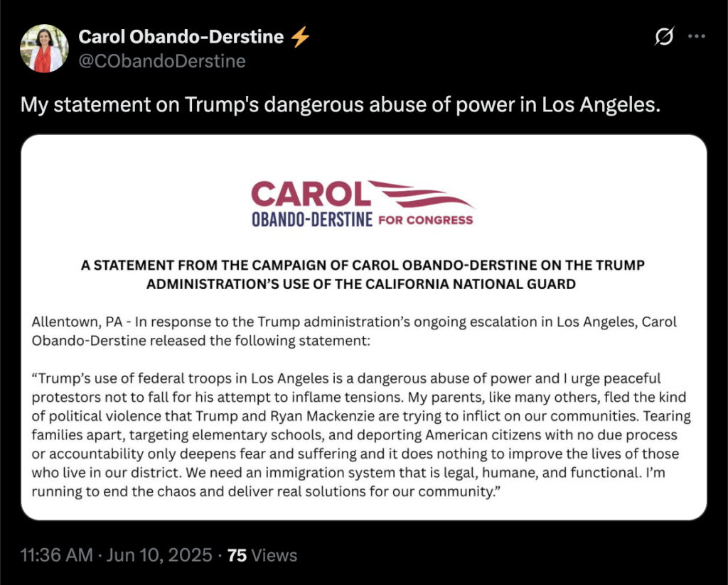“Democrat Carol Obando-Derstine’s party is the party of lawlessness. Their leaders are spoiled elitists, their grassroots are violent anarchists, and Obando-Derstine is committed to advancing this radical agenda.” – NRCC Spokeswoman Maureen O’Toole