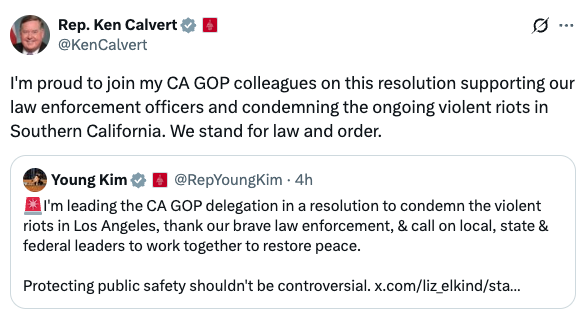 “Congressman Ken Calvert and California Republicans are leading where Democrat leadership has failed. As violent riots erupt in Southern California, Republicans are united in standing with law enforcement and demanding accountability from Newsom and Bass who have allowed chaos to take root. ” – NRCC Spokesman Christian Martinez