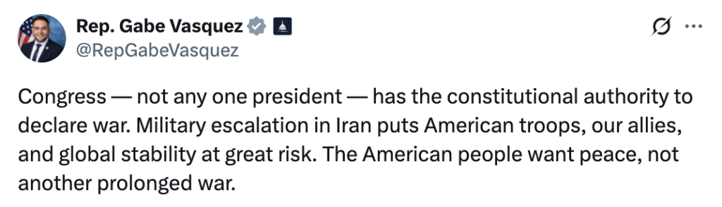 “Radical Democrat Gabe Vasquez chose Iran over America. He’s either too scared of his radical base to condemn terrorists that chant ‘Death to America’ or he agrees with them. Either way, he’s unfit to represent Americans.” – NRCC Spokesman Zach Bannon