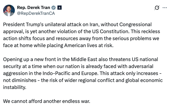 “Radical Democrat Derek Tran chose Iran over America. He’s either too scared of his radical base to condemn terrorists that chant ‘Death to America’ or he agrees with them. Either way, he’s unfit to represent Americans.” – NRCC Spokesman Christian Martinez