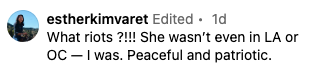 Loony Democrat Esther Kim Varet took to Instagram to call the Los Angeles riots where cops were attacked, property was torched, and American flags were set on fire “peaceful and patriotic.”