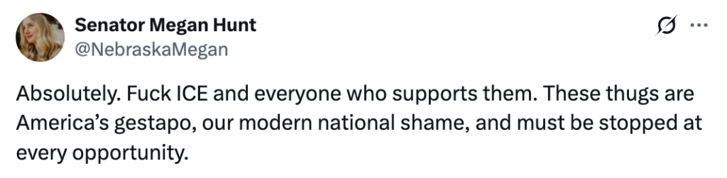 State Senator Megan Hunt shared the radical Left’s anti-law enforcement talking points on social media. This social media post comes right after ICE arrested a MS-13 kingpin from El Salvador in Omaha.