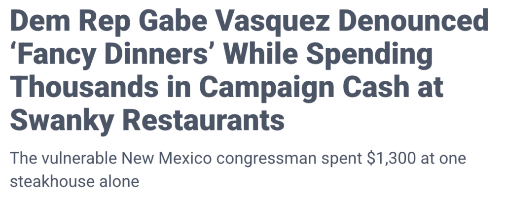 “When out of touch Democrat Gabe Vasquez isn’t hiding behind a mask to criticize law enforcement or voting to allow criminal illegal immigrants to endanger New Mexicans, he’s dining with liberal elites. Vasquez will surely miss his fancy dinners once he loses his seat next year.” – NRCC spokesman Zach Bannon