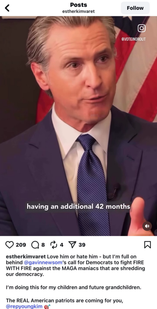 Democrat Esther Kim Varet isn’t just salivating over Newsom’s power grab – she’s banking on a rigged map to gift her a congressional seat while polishing the crown for his pathetic 2028 presidential vanity tour.
