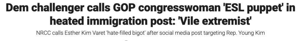 “Unhinged Democrat Esther Kim Varet is on another hate-filled, bigoted tirade – condescending, tone-deaf, and dripping with elitism. Her meltdown is straight out of the Biden ‘you ain’t Black’ playbook: racist, arrogant, and totally out of touch. No one that unhinged is getting anywhere near Congress.” – NRCC Spokesman Christian Martinez