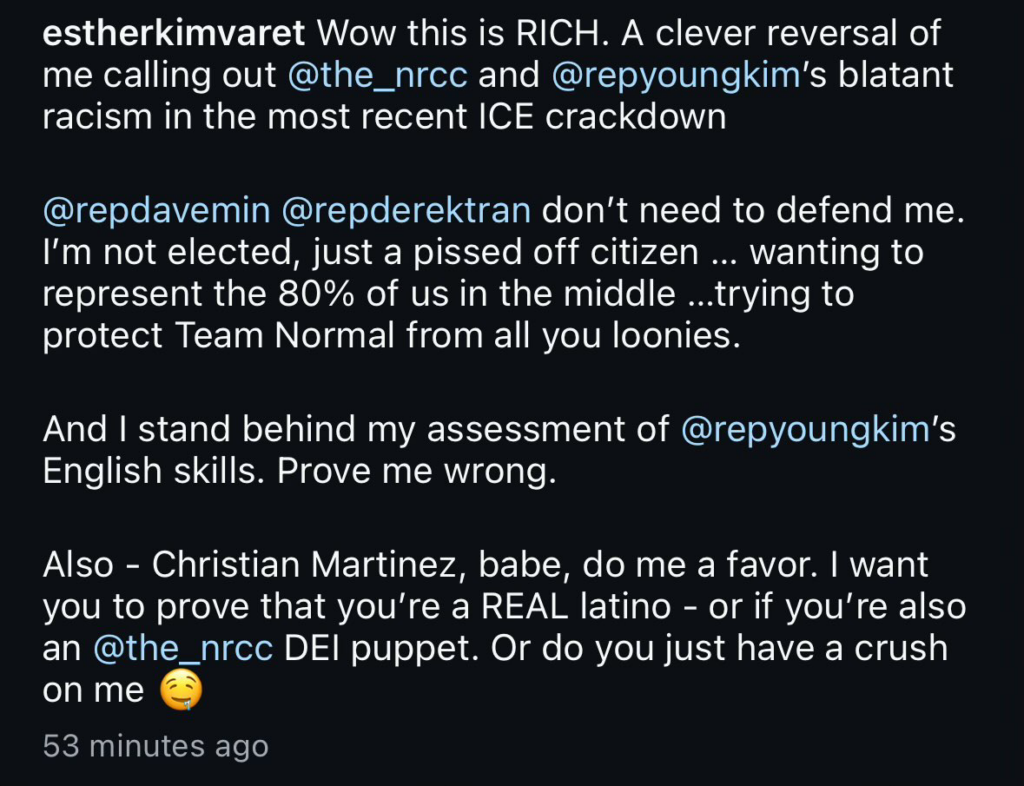 In case you missed, unhinged Esther Kim Varet unleashed a blatantly racist, bile‑filled attack against Congresswoman Young Kim and Latinos in a NOW-DELETED unhinged Instagram rant: