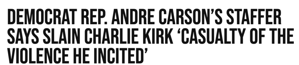 A staffer for Democrat Rep. André Carson smeared Charlie Kirk as “a casualty of the violence he incited,” spitting on his legacy instead of condemning political violence.